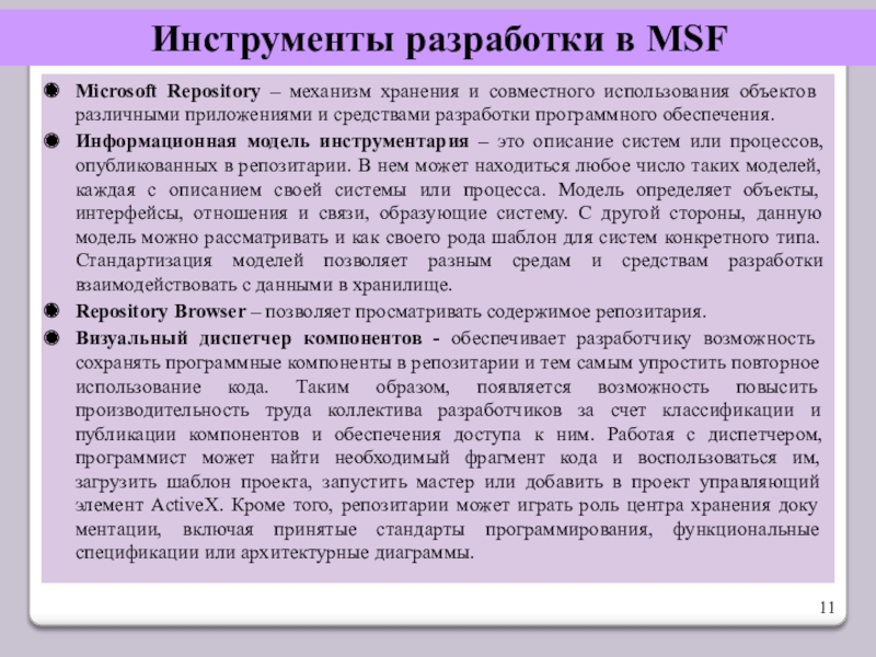 модель инструментария – это описание систем или процессов, опубликованных в репозитарии. В нем может находиться любое число таких моделей, каждая с описанием своей системы или процесса. Модель определяет объекты, интерфейсы, отношения и связи, образующие систему. С другой стороны, данную модель можно рассматривать и как своего рода шаблон для систем конкретного типа. Стандартизация моделей позволяет разным средам и средствам разработки взаимодействовать с данными в хранилище.