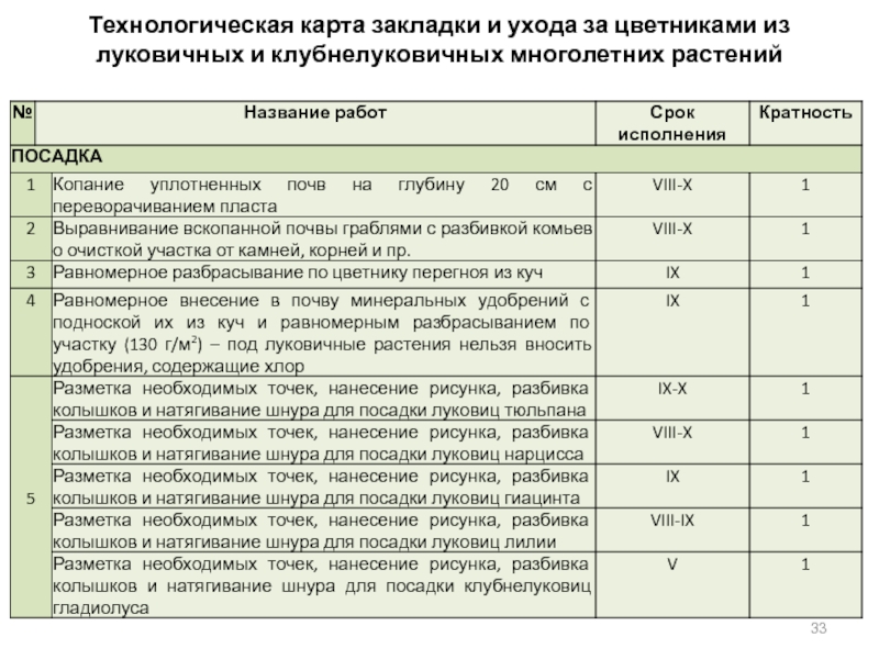 Слайд 33Технологическая карта закладки и ухода за цветниками из луковичных и