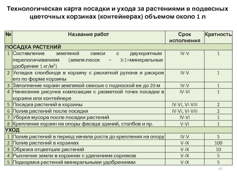 Слайд 41Технологическая карта посадки и ухода за растениями в подвесных цветочных