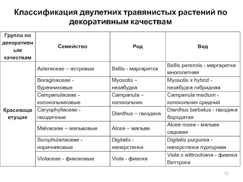 Слайд 13Классификация двулетних травянистых растений по декоративным качествам