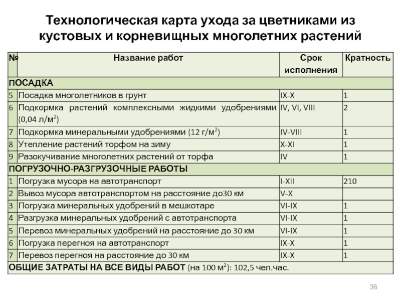 Слайд 38Технологическая карта ухода за цветниками из кустовых и корневищных многолетних