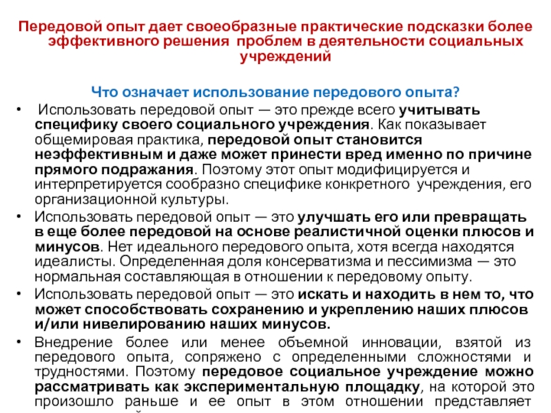В некоторых социальных учреждениях имеются сборники конкретных ситуаций, с которыми знакомят вновь принятых на работу сотрудников для сокращения "опытов быстротекущей жизни", т. е. для избегания в последующем типичных ошибок.