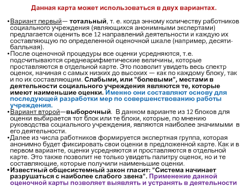 Известный общесистемный закон гласит: "Система начинает разрушаться с наиболее слабого звена". Применение данной оценочной карты позволяет выявлять и устранять в деятельности социального учреждения слабые звенья.