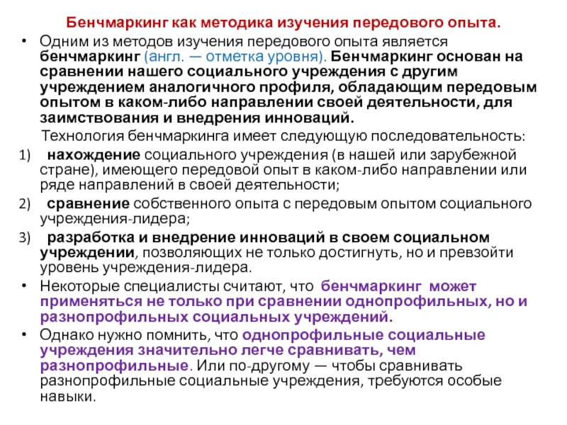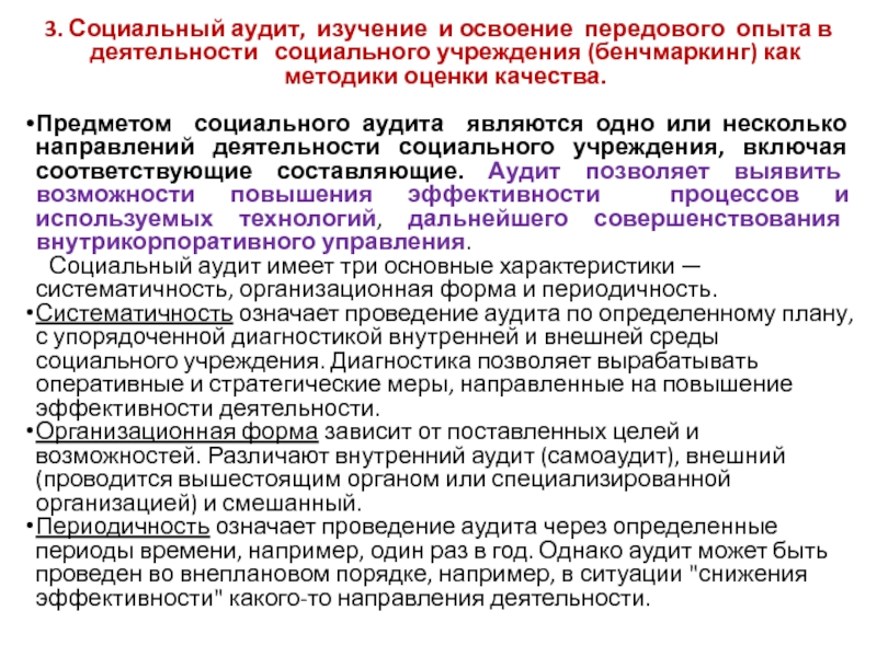 Социальный аудит, изучение и освоение передового опыта в деятельности социального учреждения (бенчмаркинг) как методики оценки качества.