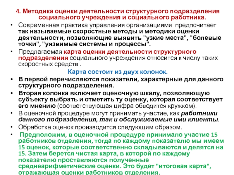 Методика оценки деятельности структурного подразделения социального учреждения и социального работника.