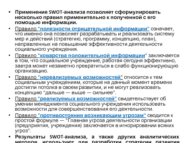 Слайд 7Применение SWOT-анализа позволяет сформулировать несколько правил применительно к полученной с