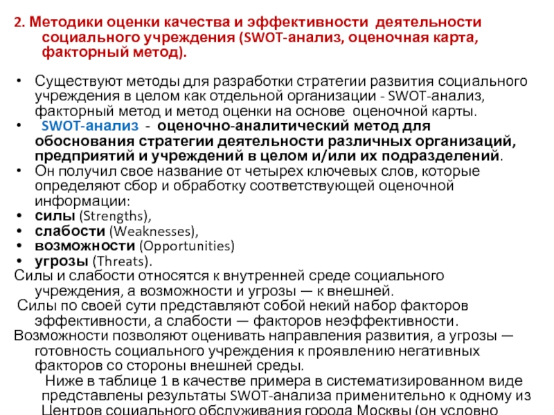 Методики оценки качества и эффективности деятельности социального учреждения (SWOT-анализ, оценочная карта, факторный метод).