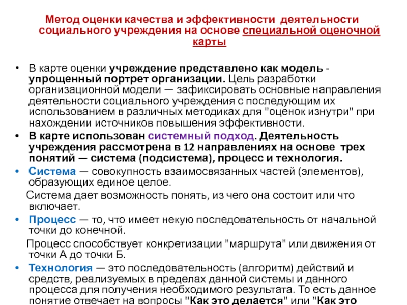 Слайд 8Метод оценки качества и эффективности деятельности социального учреждения на основе