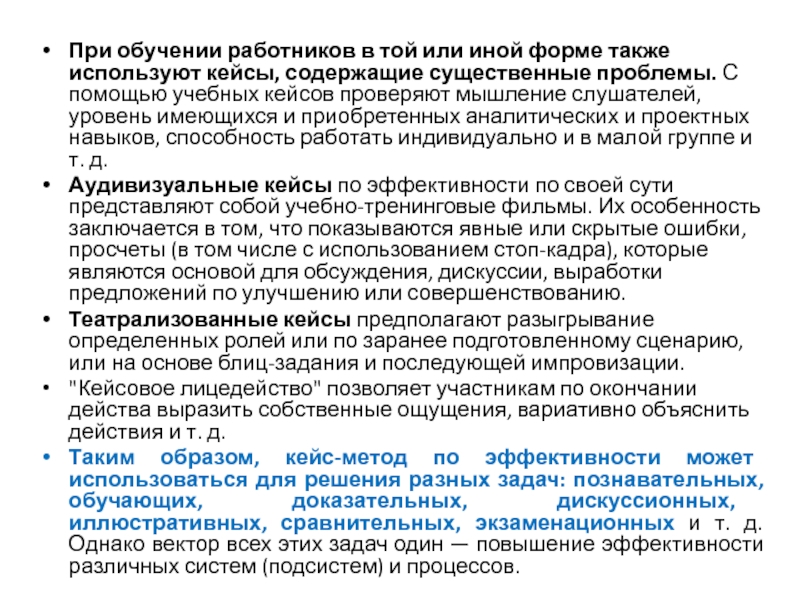Таким образом, кейс-метод по эффективности может использоваться для решения разных задач: познавательных, обучающих, доказательных, дискуссионных, иллюстративных, сравнительных, экзаменационных и т. д. Однако вектор всех этих задач один — повышение эффективности различных систем (подсистем) и процессов.