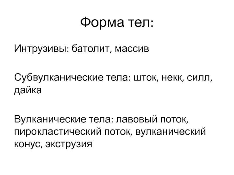Вулканические тела: лавовый поток, пирокластический поток, вулканический конус, экструзия