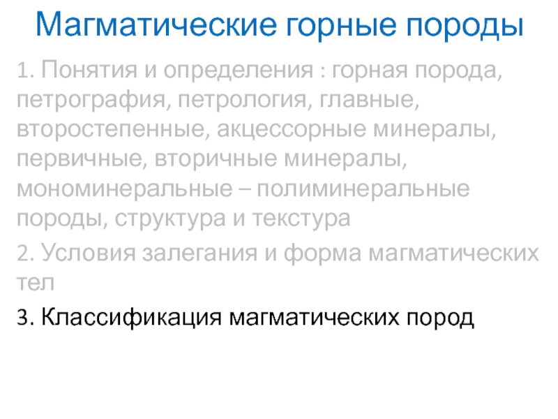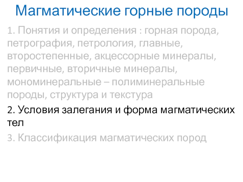 Магматическая горная порода образуется в результате кристаллизации магматического расплава и содержит магматический парагенезис минералов.