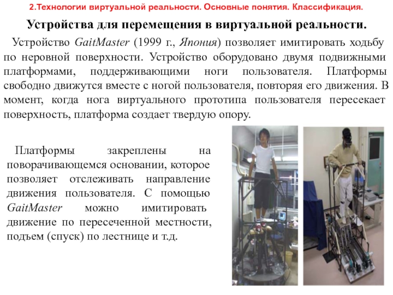 Платформы закреплены на поворачивающемся основании, которое позволяет отслеживать направление движения пользователя. С помощью GaitMaster можно имитировать движение по пересеченной местности, подъем (спуск) по лестнице и т.д.