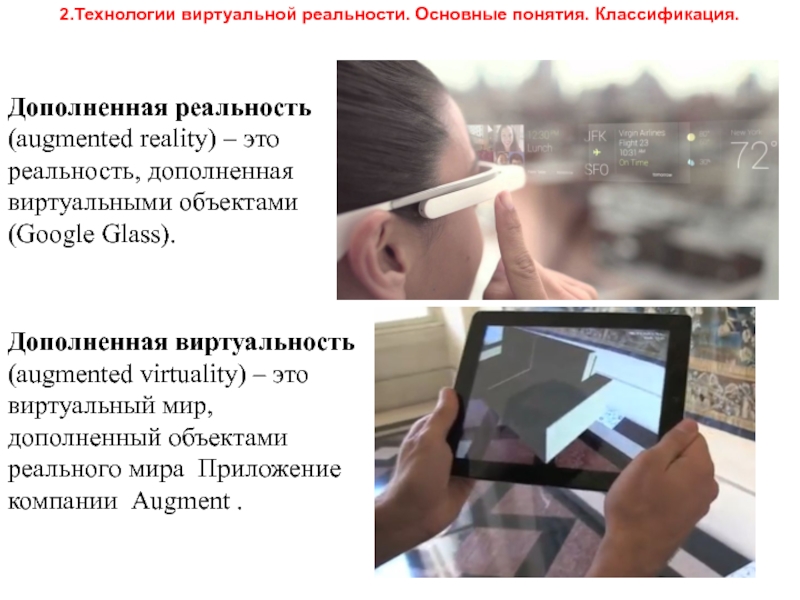 Дополненная реальность (augmented reality) – это реальность, дополненная виртуальными объектами (Google Glass).