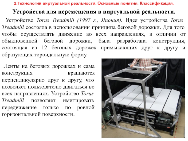 Ленты на беговых дорожках и сама конструкция вращаются перпендикулярно друг к другу, что позволяет пользователю двигаться во всех направлениях. Устройство Torus Treadmill позволяет имитировать передвижение только по ровной горизонтальной поверхности.