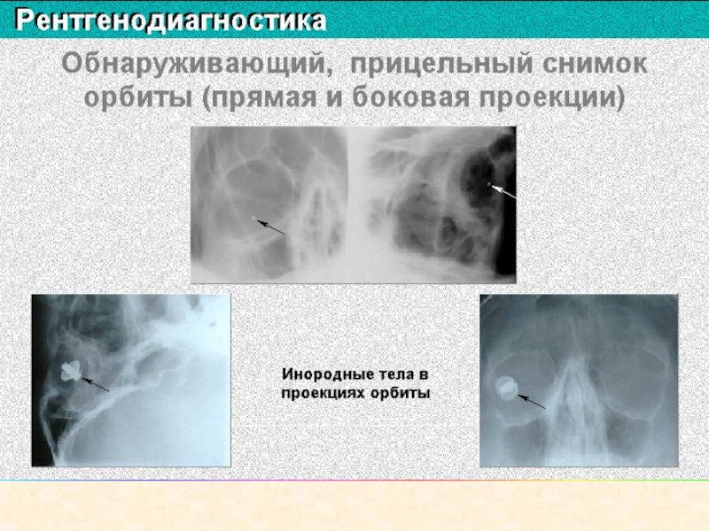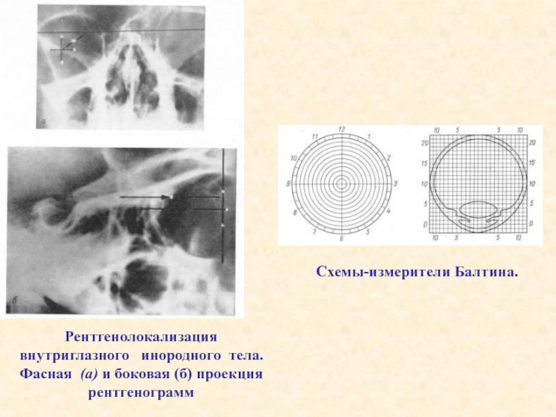 Слайд 24Рентгенолокализация внутриглазного инородного тела. Фасная (а) и боковая
