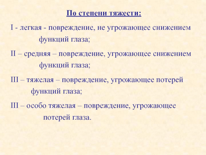III – тяжелая – повреждение, угрожающее потерей функций глаза;