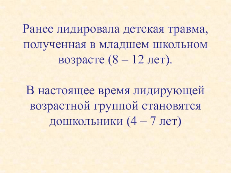 Слайд 10Ранее лидировала детская травма, полученная в младшем школьном возрасте (8