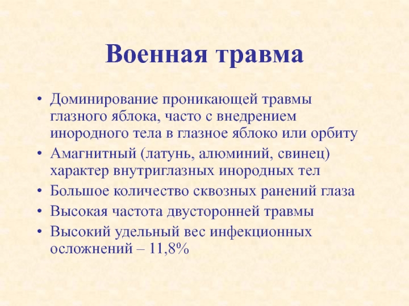 Доминирование проникающей травмы глазного яблока, часто с внедрением инородного