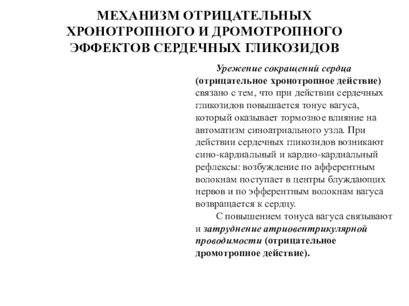Слайд 14МЕХАНИЗМ ОТРИЦАТЕЛЬНЫХ ХРОНОТРОПНОГО И ДРОМОТРОПНОГО ЭФФЕКТОВ СЕРДЕЧНЫХ ГЛИКОЗИДОВ