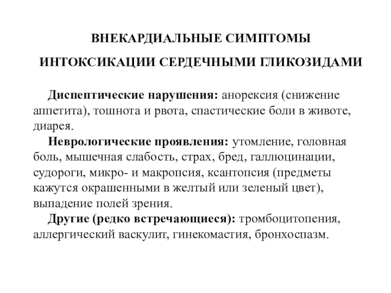 Слайд 19ВНЕКАРДИАЛЬНЫЕ СИМПТОМЫ ИНТОКСИКАЦИИ СЕРДЕЧНЫМИ ГЛИКОЗИДАМИ