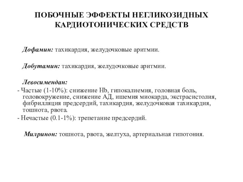 Слайд 23ПОБОЧНЫЕ ЭФФЕКТЫ НЕГЛИКОЗИДНЫХ КАРДИОТОНИЧЕСКИХ СРЕДСТВ