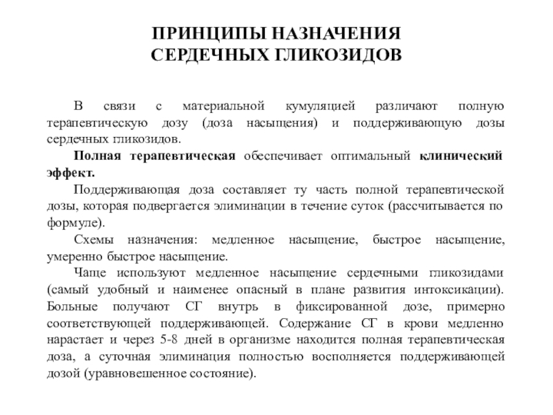 Чаще используют медленное насыщение сердечными гликозидами (самый удобный и наименее опасный в плане развития интоксикации). Больные получают СГ внутрь в фиксированной дозе, примерно соответствующей поддерживающей. Содержание СГ в крови медленно нарастает и через 5-8 дней в организме находится полная терапевтическая доза, а суточная элиминация полностью восполняется поддерживающей дозой (уравновешенное состояние).