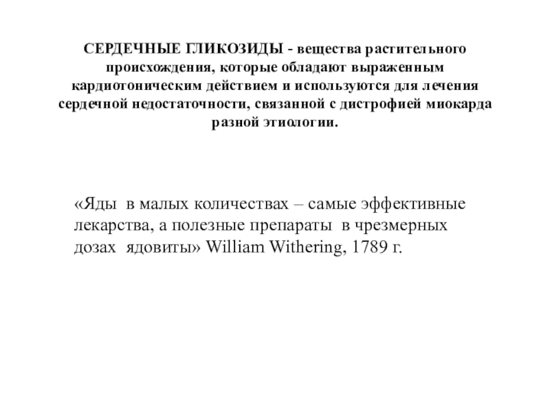 «Яды в малых количествах – самые эффективные лекарства, а полезные препараты в чрезмерных дозах ядовиты» William Withering, 1789 г.