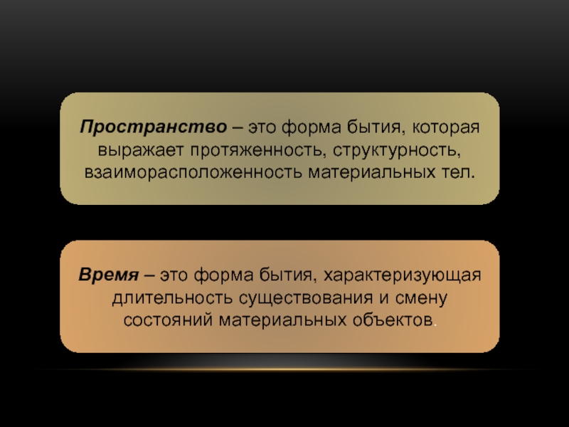 Слайд 30Пространство – это форма бытия, которая выражает протяженность, структурность, взаиморасположенность материальных