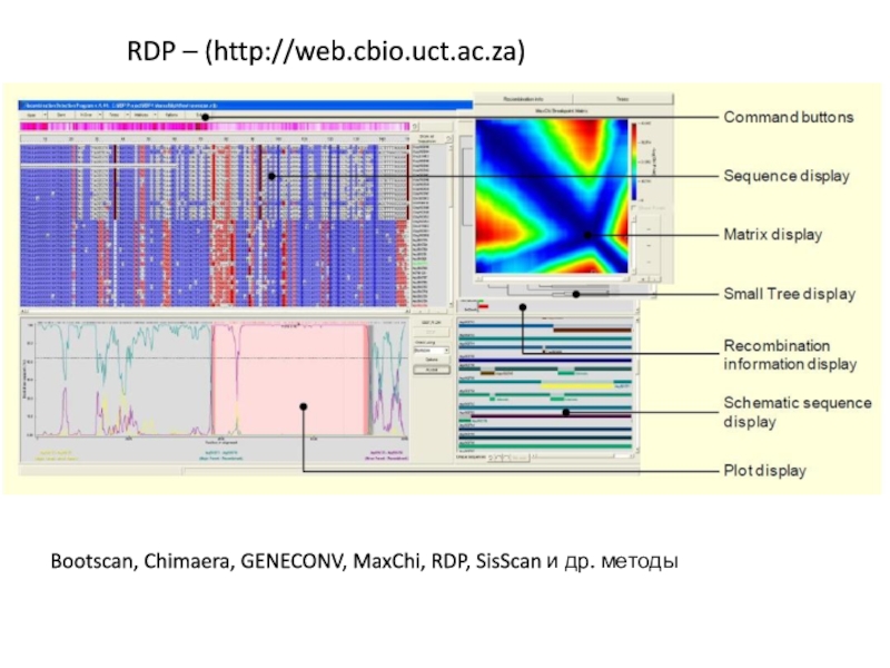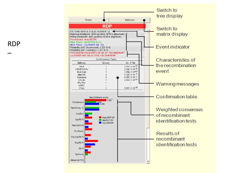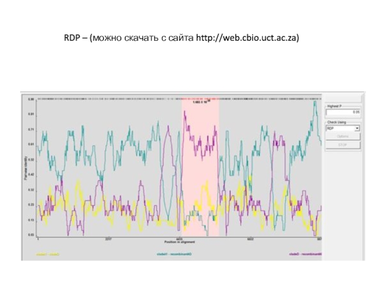 Predicting recombination regions with HMM (Hidden Markov Model) implemented in TOPALi. Default parameter values were used. The horizontal axis represents the site in the alignment, the vertical axis represents the probability for topology change, and the dotted line shows the 95 percentile under the null hypothesis of no recombination. SARS-CoV, IBV, BCoV and HCoV was used, where SARS-CoV-severe acute respiratory syndrome-associated coronavirus, BCoV-bovine coronavirus, HCoV-human coronavirus, and IBV-avian infectious bronchitis virus