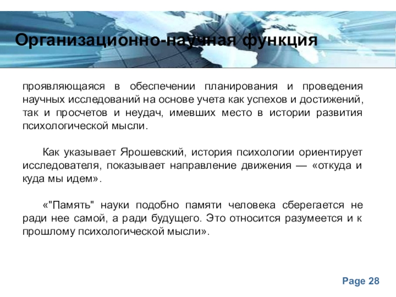 Как указывает Ярошевский, история психологии ориентирует исследователя, показывает направление движения — «откуда и куда мы идем».