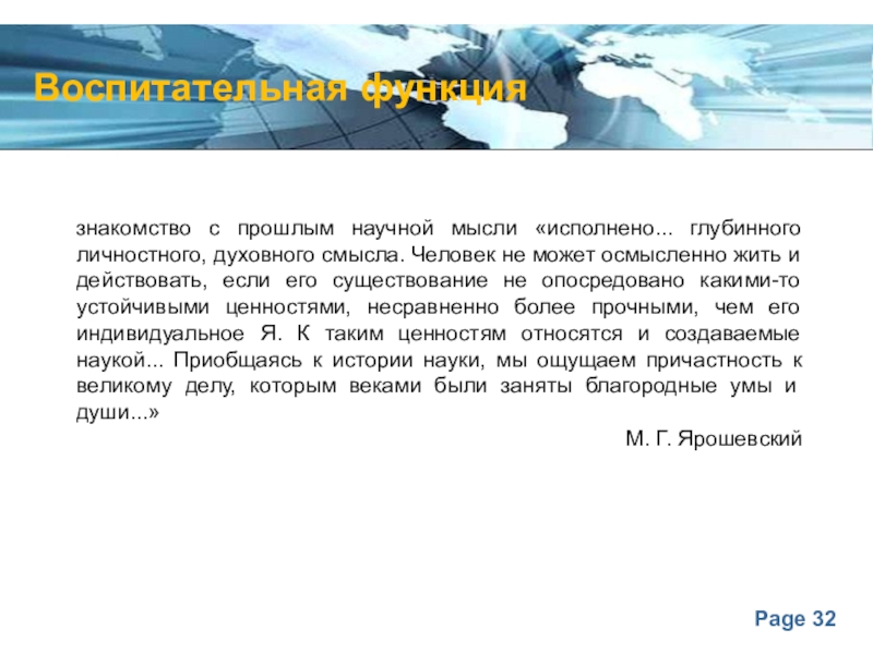 его существование не опосредовано какими-то устойчивыми ценностями, несравненно более прочными, чем его индивидуальное Я. К таким ценностям относятся и создаваемые наукой... Приобщаясь к истории науки, мы ощущаем причастность к великому делу, которым веками были заняты благородные умы и души...»