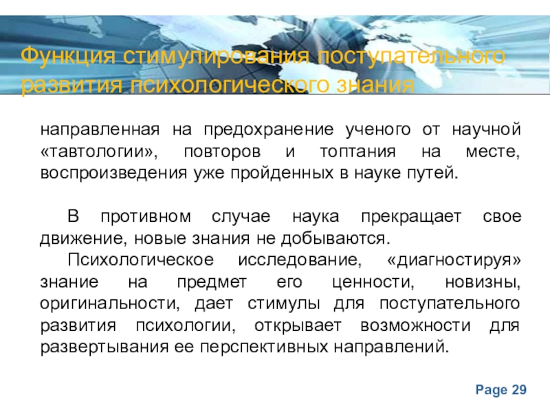 Психологическое исследование, «диагностируя» знание на предмет его ценности, новизны, оригинальности, дает стимулы для поступательного развития психологии, открывает возможности для развертывания ее перспективных направлений.
