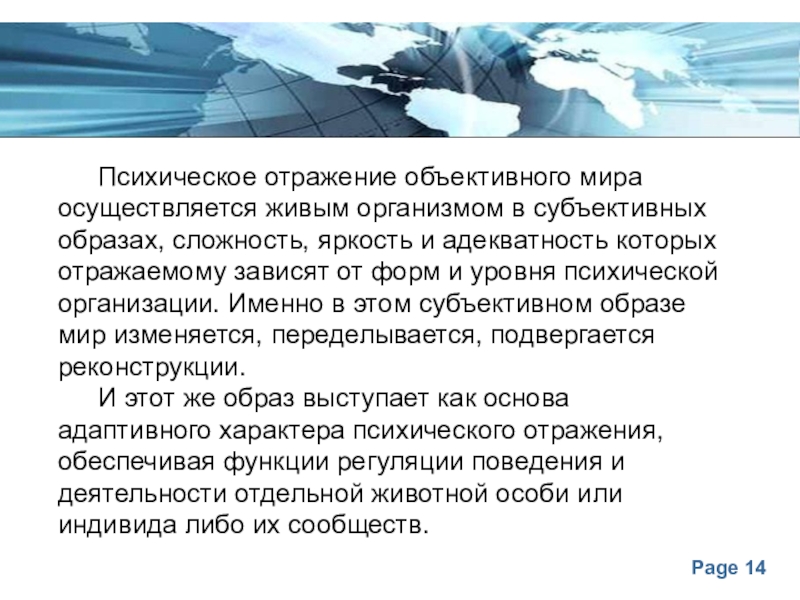 Слайд 14 Психическое отражение объективного мира осуществляется живым организмом в субъективных образах,