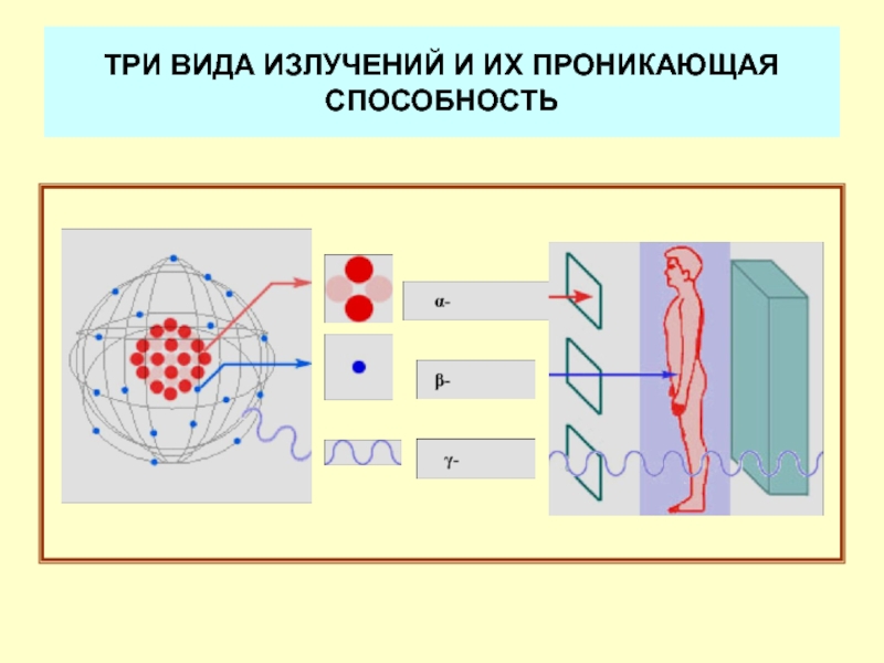 Слайд 4ТРИ ВИДА ИЗЛУЧЕНИЙ И ИХ ПРОНИКАЮЩАЯ СПОСОБНОСТЬ