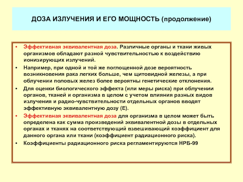 Для оценки биологического эффекта (или меры риска) при облучении органов, тканей и организма в целом с учетом влияния разных видов излучения и радио-чувствительности отдельных органов вводят эффективную эквивалентную дозу (Е).