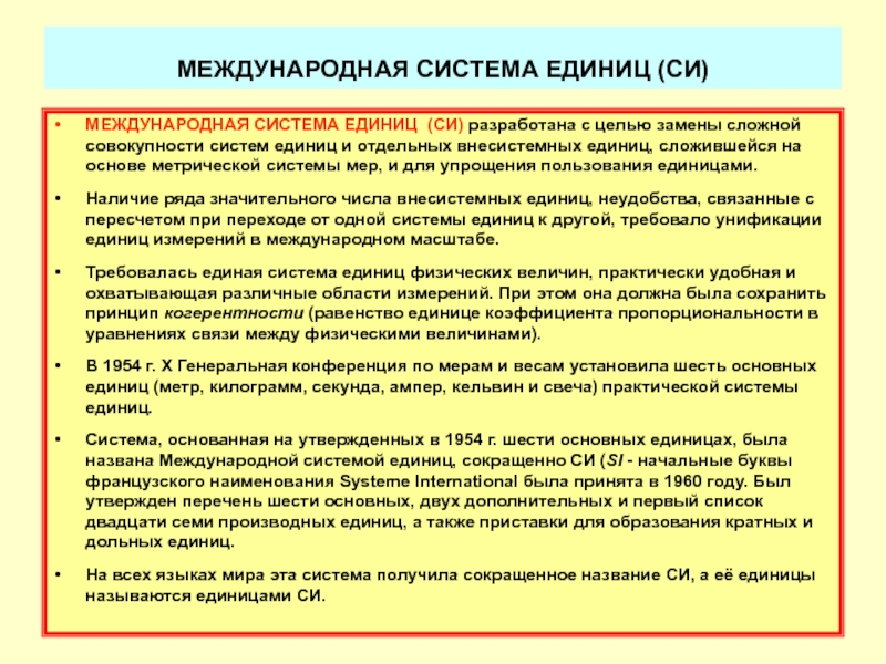 Наличие ряда значительного числа внесистемных единиц, неудобства, связанные с пересчетом при переходе от одной системы единиц к другой, требовало унификации единиц измерений в международном масштабе.