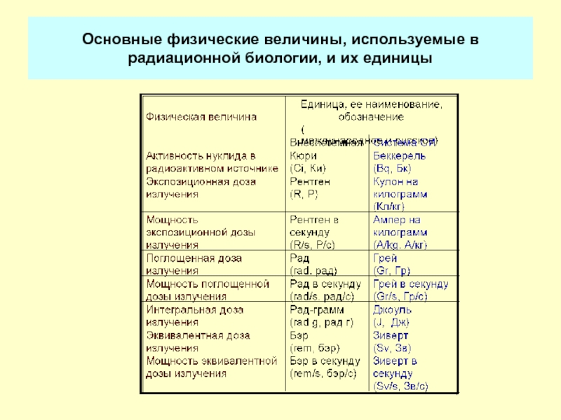 Слайд 16Основные физические величины, используемые в радиационной биологии, и их единицы