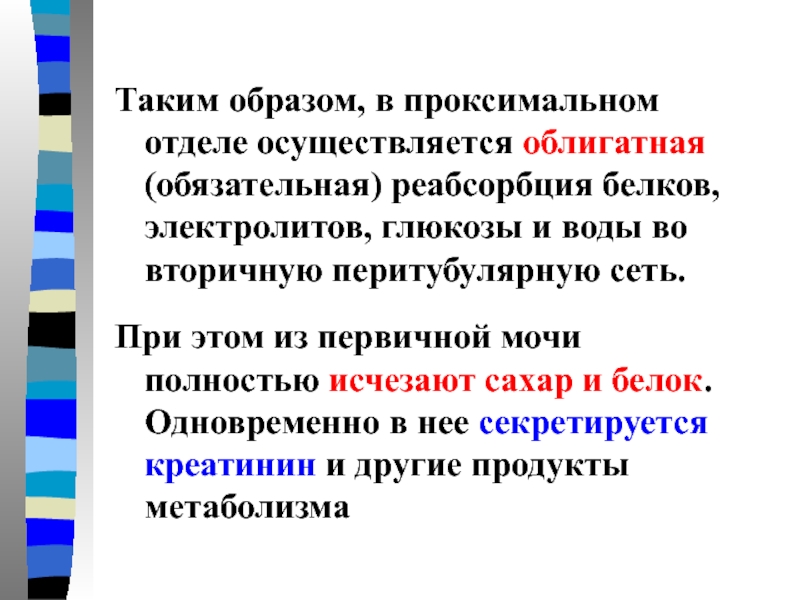 Слайд 33Таким образом, в проксимальном отделе осуществляется облигатная (обязательная) реабсорбция белков,
