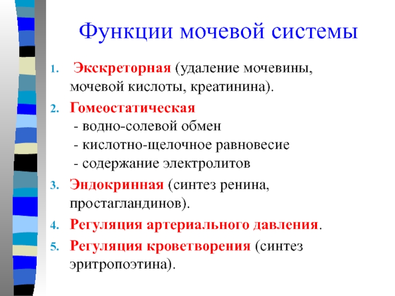 Экскреторная (удаление мочевины, мочевой кислоты, креатинина).