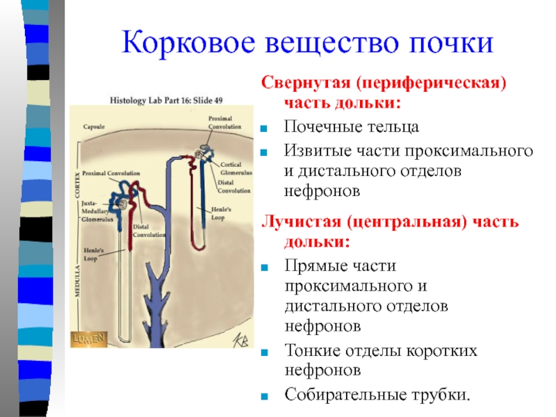 Слайд 9Собирательные трубки начинаются в корковом веществе (мозговые лучи), переходят в