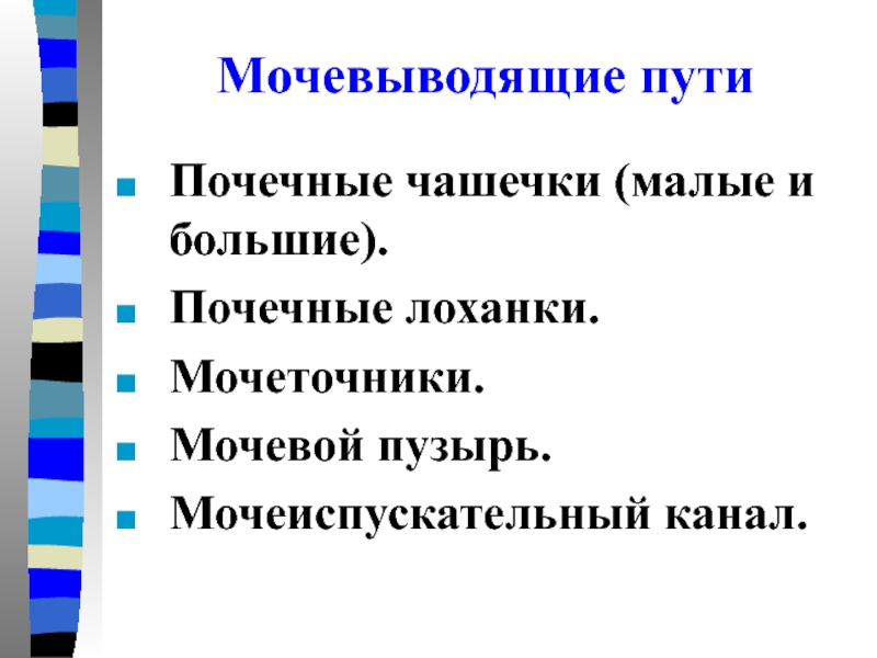 Мочевыводящие пути (почечные чашечки, лоханки, мочеточники, мочевой пузырь,