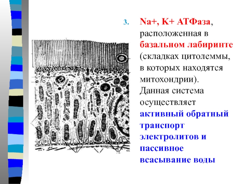 Слайд 32Na+, K+ АТФаза, расположенная в базальном лабиринте (складках цитолеммы, в