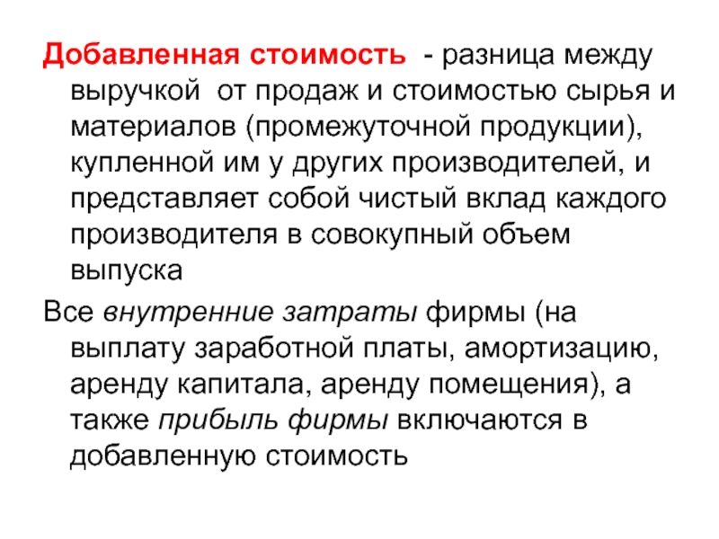 Все внутренние затраты фирмы (на выплату заработной платы, амортизацию, аренду капитала, аренду помещения), а также прибыль фирмы включаются в добавленную стоимость