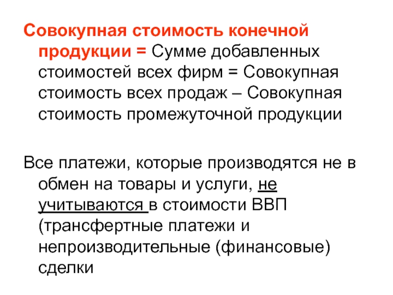 платежи, которые производятся не в обмен на товары и услуги, не учитываются в стоимости ВВП (трансфертные платежи и непроизводительные (финансовые) сделки