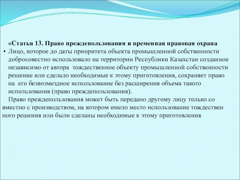 Слайд 9«Статья 13. Право преждепользования и временная правовая охрана