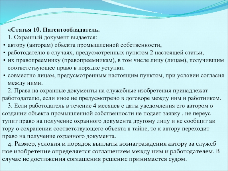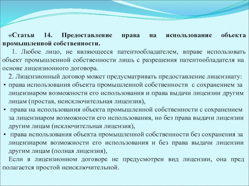 Слайд 10«Статья 14. Предоставление права на использование объекта промышленной собственности.