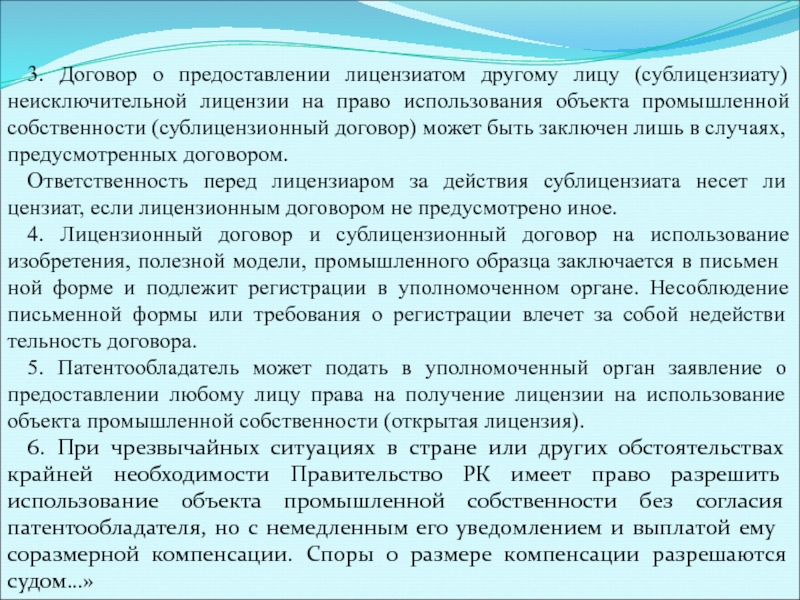 6. При чрезвычайных ситуациях в стране или других обстоятельствах крайней необходимости Правительство РК имеет право разрешить использование объекта промышленной собственности без согласия патентообладателя, но с немедленным его уведомлением и выплатой ему соразмерной компенсации. Споры о размере компенсации разрешаются судом…»