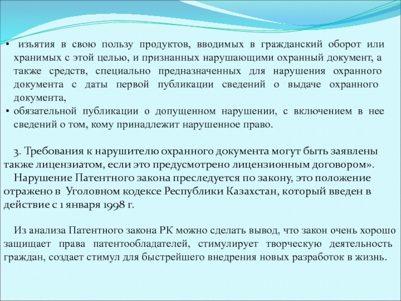 Нарушение Патентного закона преследуется по закону, это положение отражено в Уголовном кодексе Республики Казахстан, который введен в действие с 1 января 1998 г.