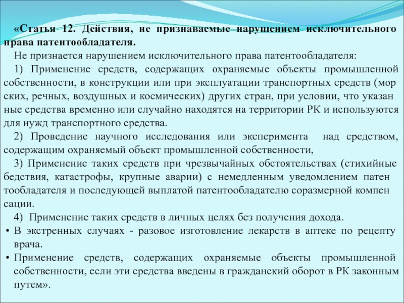 Слайд 8«Статья 12. Действия, не признаваемые нарушением исключительного права патентообладателя.