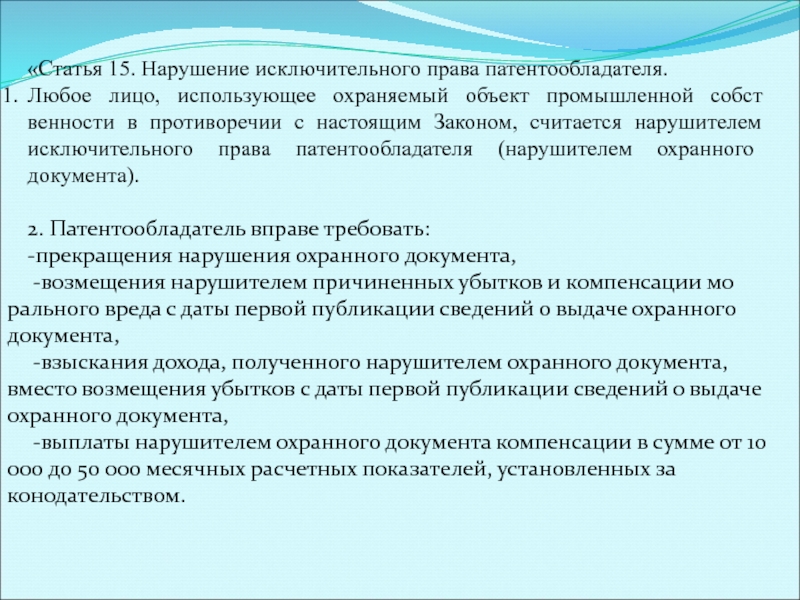Слайд 12«Статья 15. Нарушение исключительного права патентообладателя.